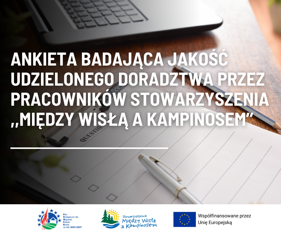 Zapraszamy Państwa do wypełnienia ankiety badającej jakość udzielonego doradztwa przez pracowników Stowarzyszenia ,,Między Wisłą a Kampinosem’’, której celem jest określenie, jakości i efektywności świadczonego doradztwa w ramach realizacji Lokalnej Strategii Rozwoju Stowarzyszenia "Między Wisłą a Kampinosem" na lata 2023-2027.